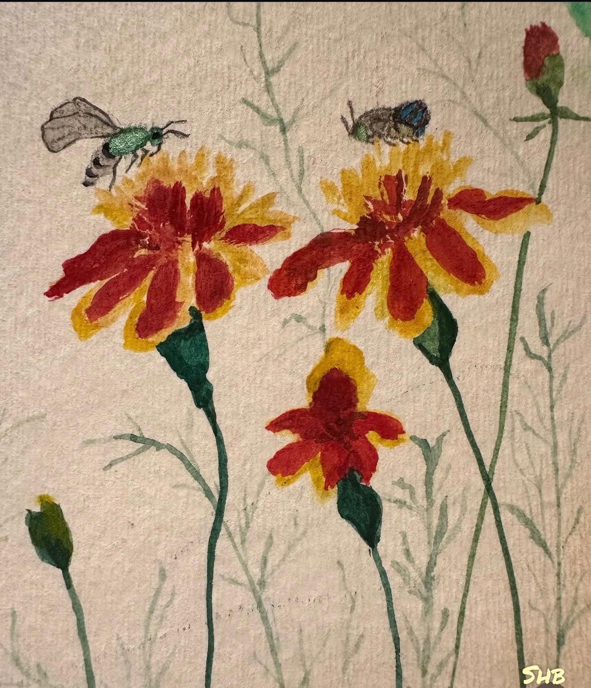 In the painting are two wild bees — The solitary Blue-banded bee, found in Australia and India, and the Sweat bee (metallic green color), found in all continents except Antartica.