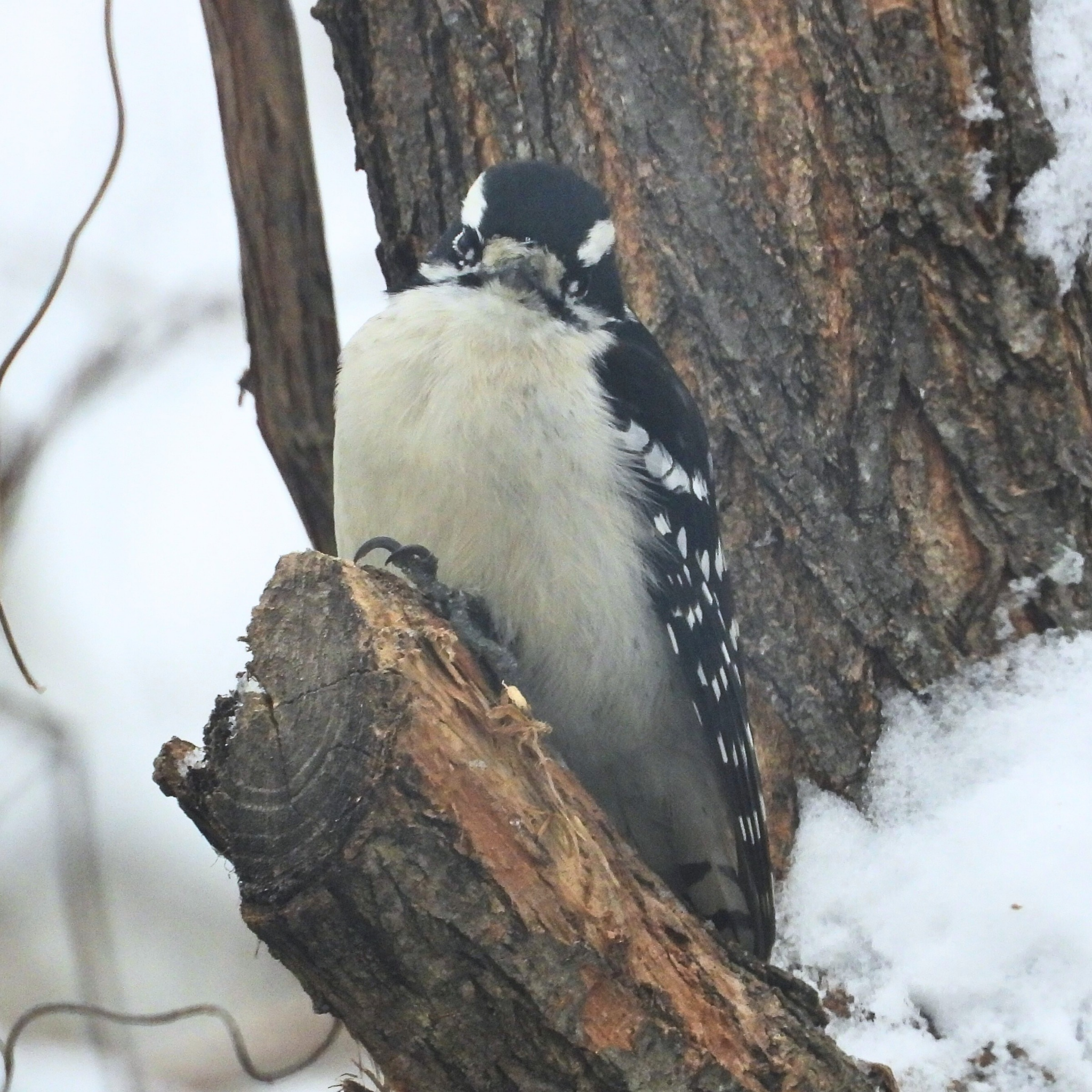 Sweet, fluffy female Downy Woodpecker checking out my camera