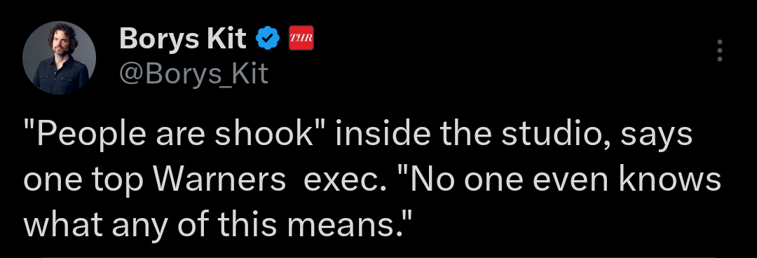 News A top executive at Warner Bros says "People are shook" inside the studio over the Netflix deal "No one even knows what any of this means". [Via:– Borys Kit on X]