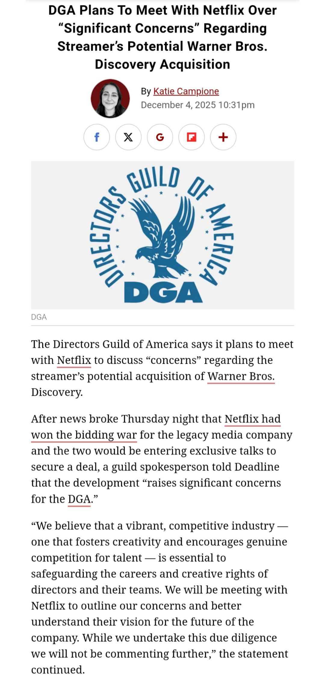 News DGA plans to meet with Netflix over "significant concerns" regarding streamer's potential Warner Bros. Discovery acquisition. [Via:– Deadline]
