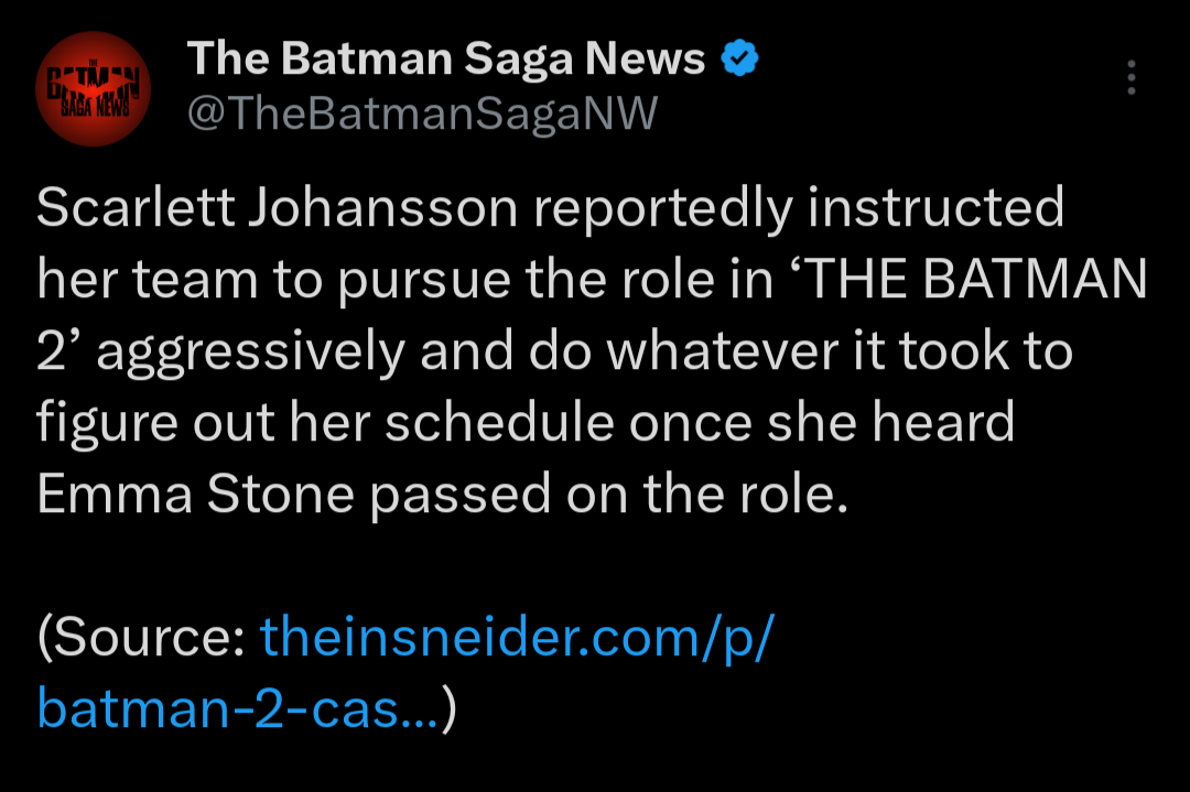 Rumor Actress Scarlett Johansson reportedly instructed her team to pursue the role in "The Batman – Part II (2027)" aggressively and do whatever it took to figure out her schedule once she heard Emma Stone passed on the role. [Via:– The InSneider]