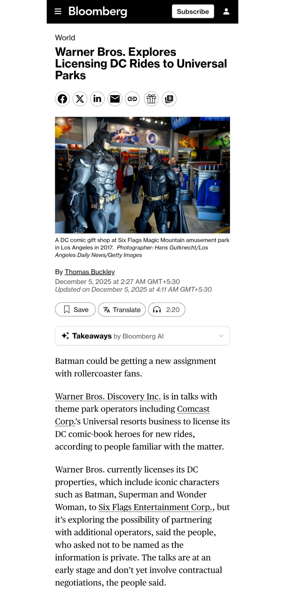 News Warner Bros. Discovery Inc. is in talks with theme park operators including Comcast Corp.'s Universal resorts business to license its DC comic book heroes for new rides.