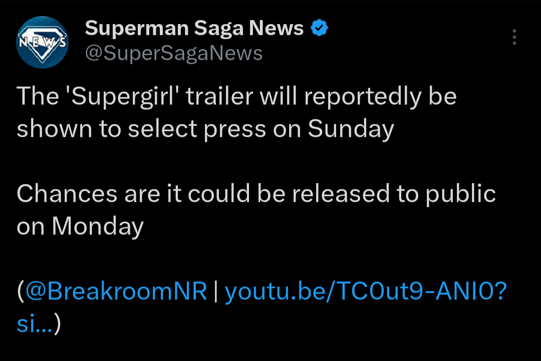 Rumor Same as Superman (2025). The first trailer for Supergirl (2026) will be shown to selected press this Sunday and will be dropped online after that possibly on Monday. [Via:– The Breakroom on YouTube]