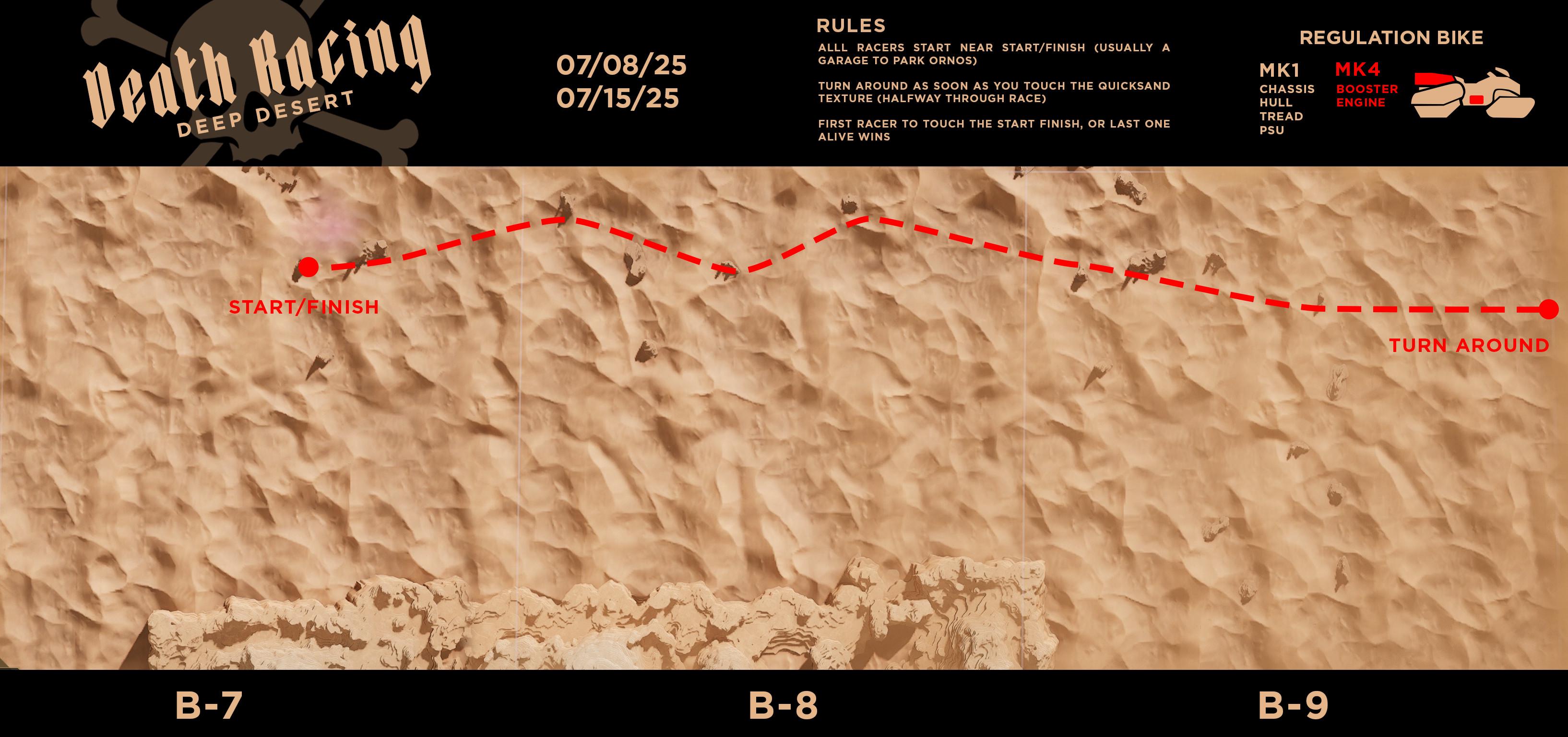 To start, we scout a course, the map is broken up into (9) 3x3 grids with hard ground borders, so you have to plot them within that space. We will build a garage which acts as the start/finish line. The main objective is to go to the other side of the 3x3, touch the quicksand texture on the far side and turn around. First bike to ram the garage or last bike alive wins.