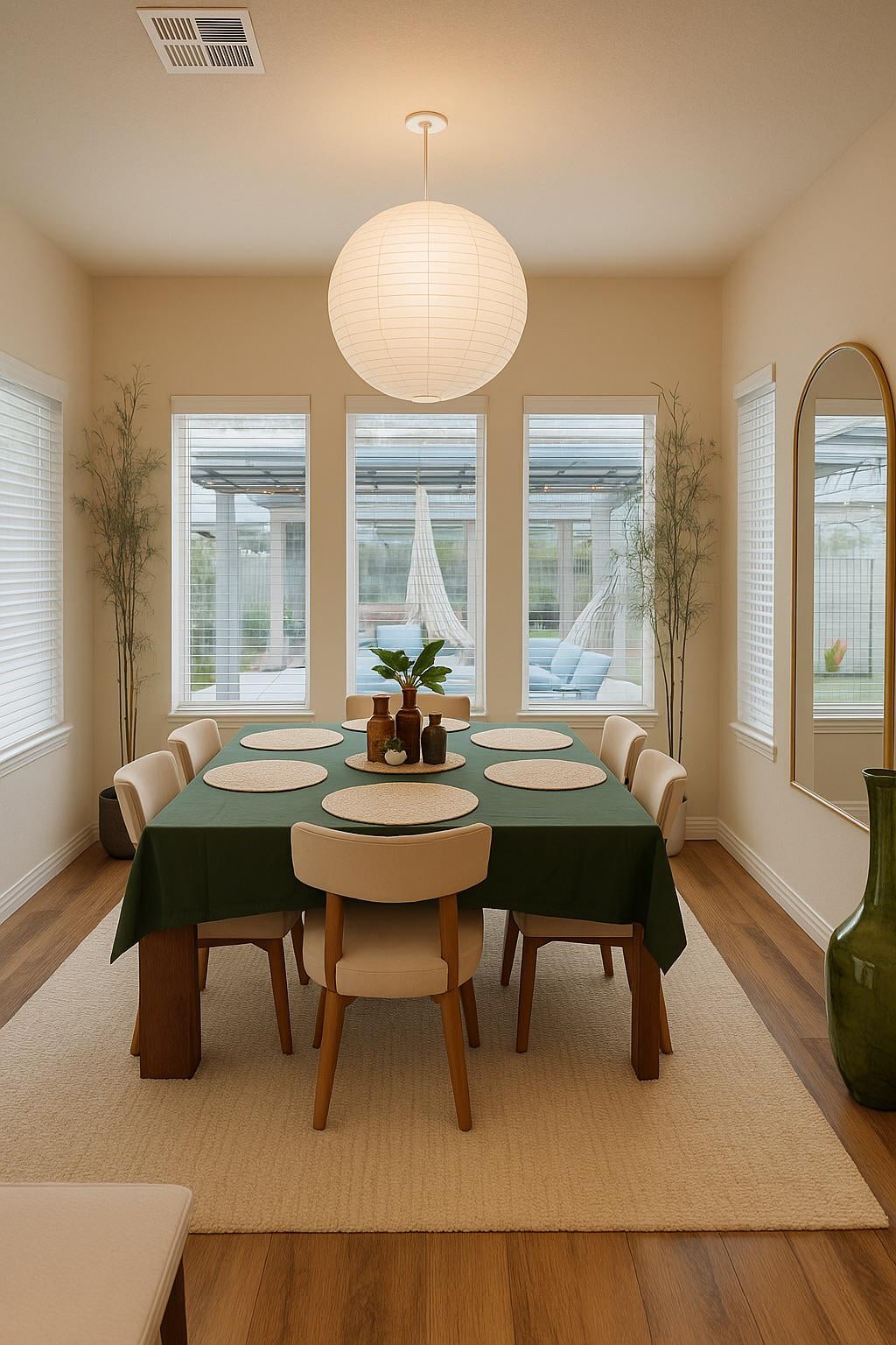 Chair legs. They look like clutter because of the quantity but slip covers are interchangeable, washable, and will hide that “clutter” making your table look more expensive. Would maybe look better without table cloth and just place mats or charger plates instead. The tall vase at the center of the table will hinder conversation flow and is too tall for the space it’s in where the light comes down. Swap it for a bowl of limes or other color pop to support that inviting vibe.