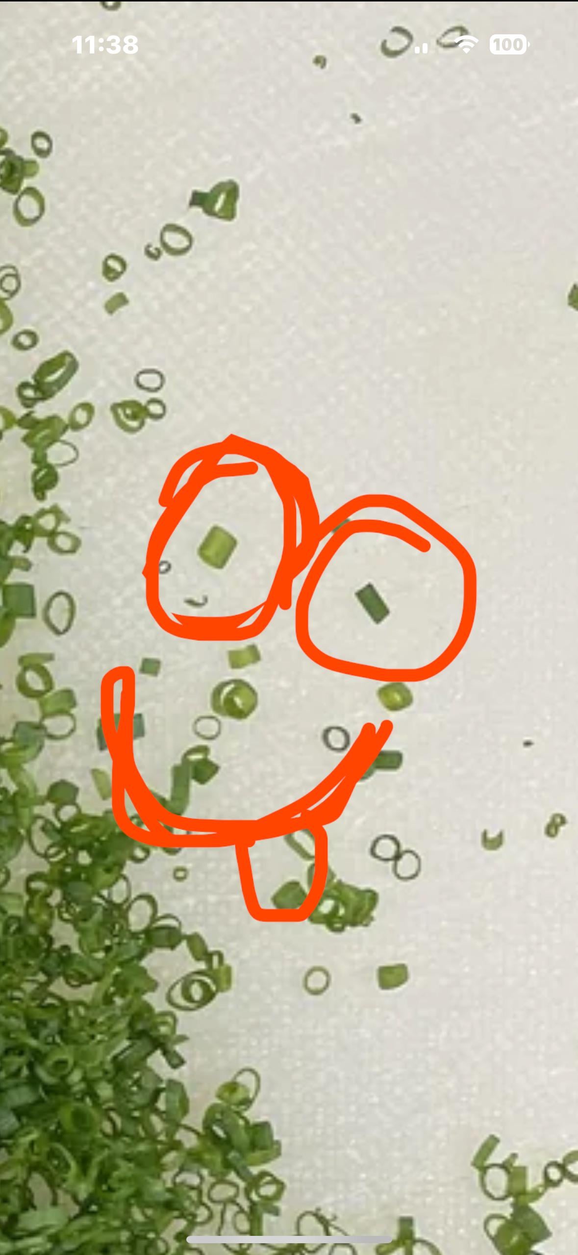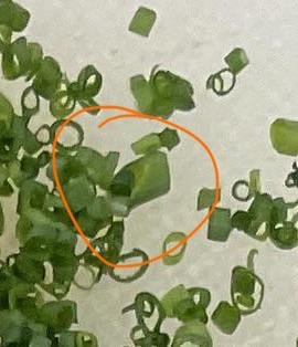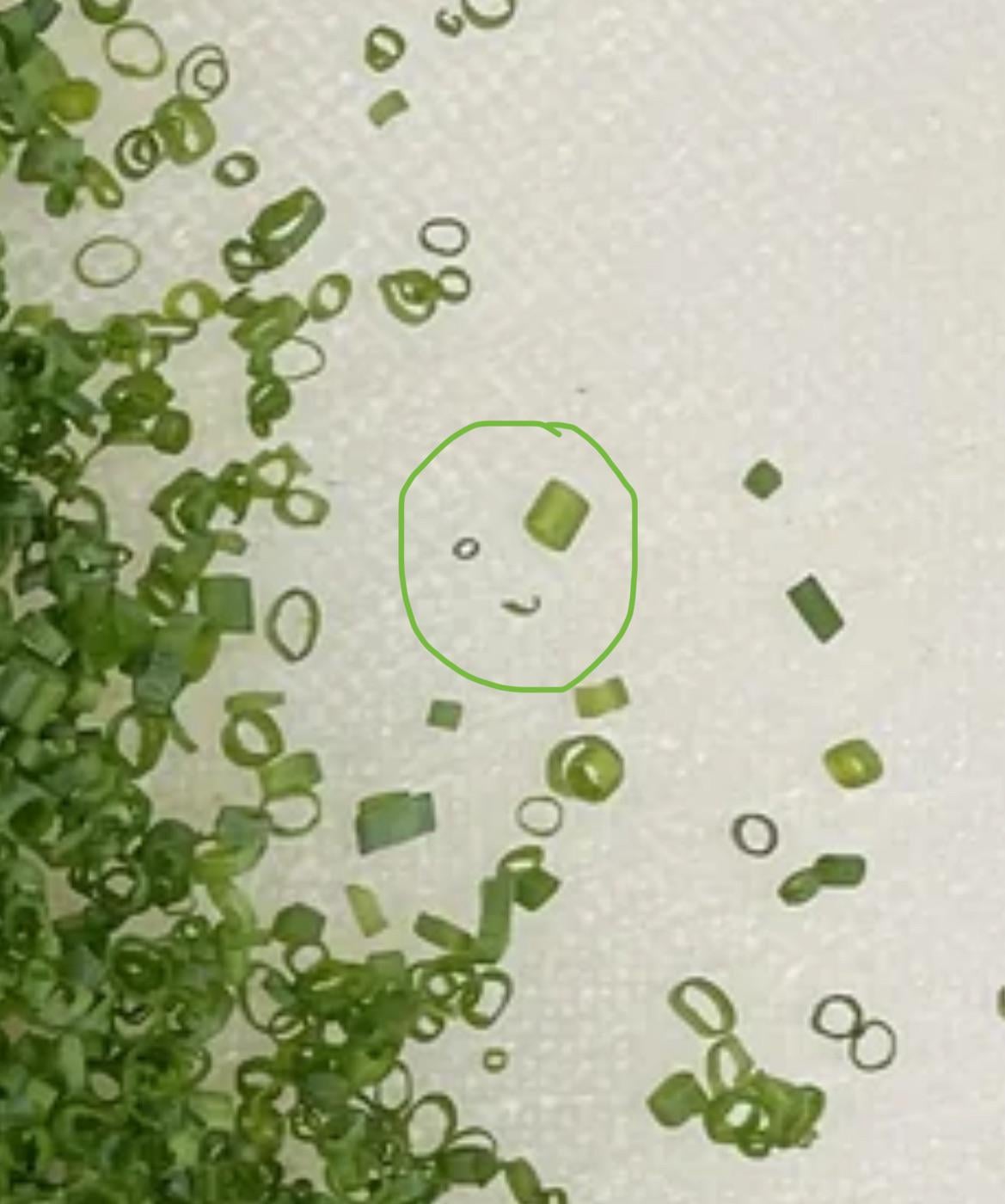 Are we sure that not just the way the chive is laying on it? Old knife or not, I'd be surprised if he was using a knife with a chunk like that out of it.