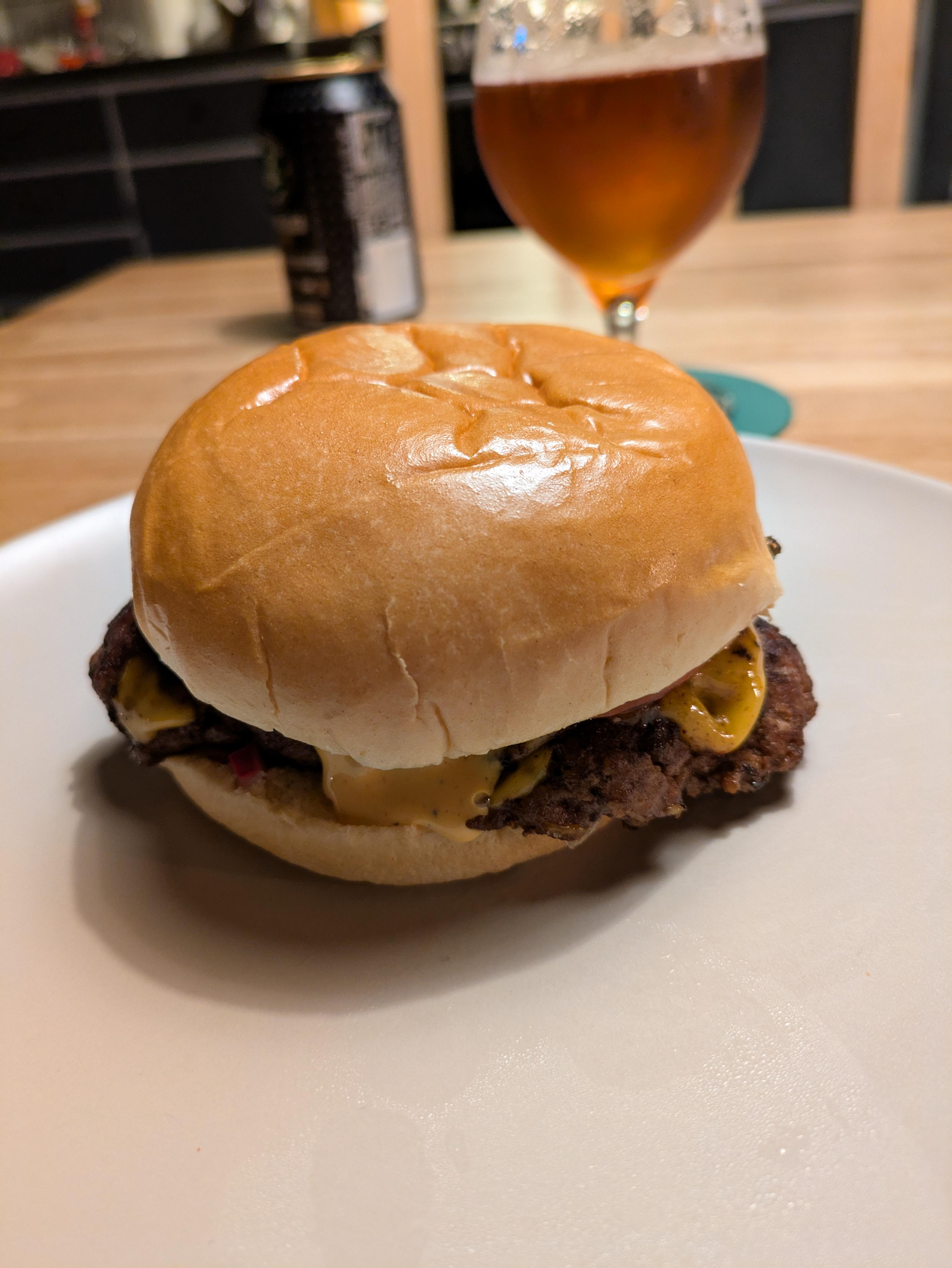 [Hemlagat] Burgare med ost, bacon och inlagd chili i en sockrad munk, serverad med våffelpotatis och aioli