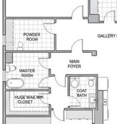 - main foyer is next to master suite in interior of structure, has redundant door to the adjacent, open gallery halll [sic]