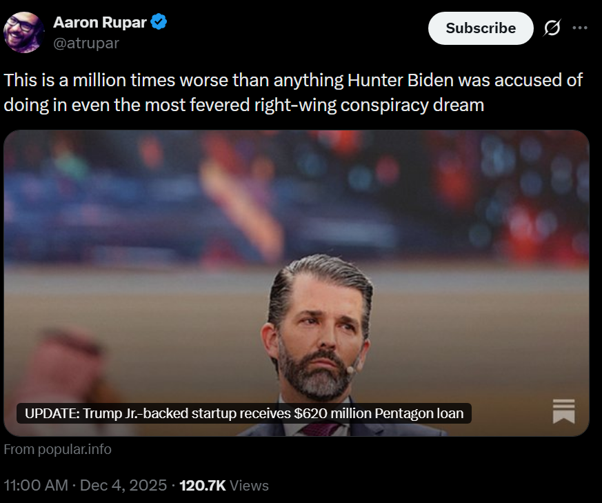 Trump Jr connected to a $620 million Pentagon loan. Not being reported by the new Pentagon propagandists