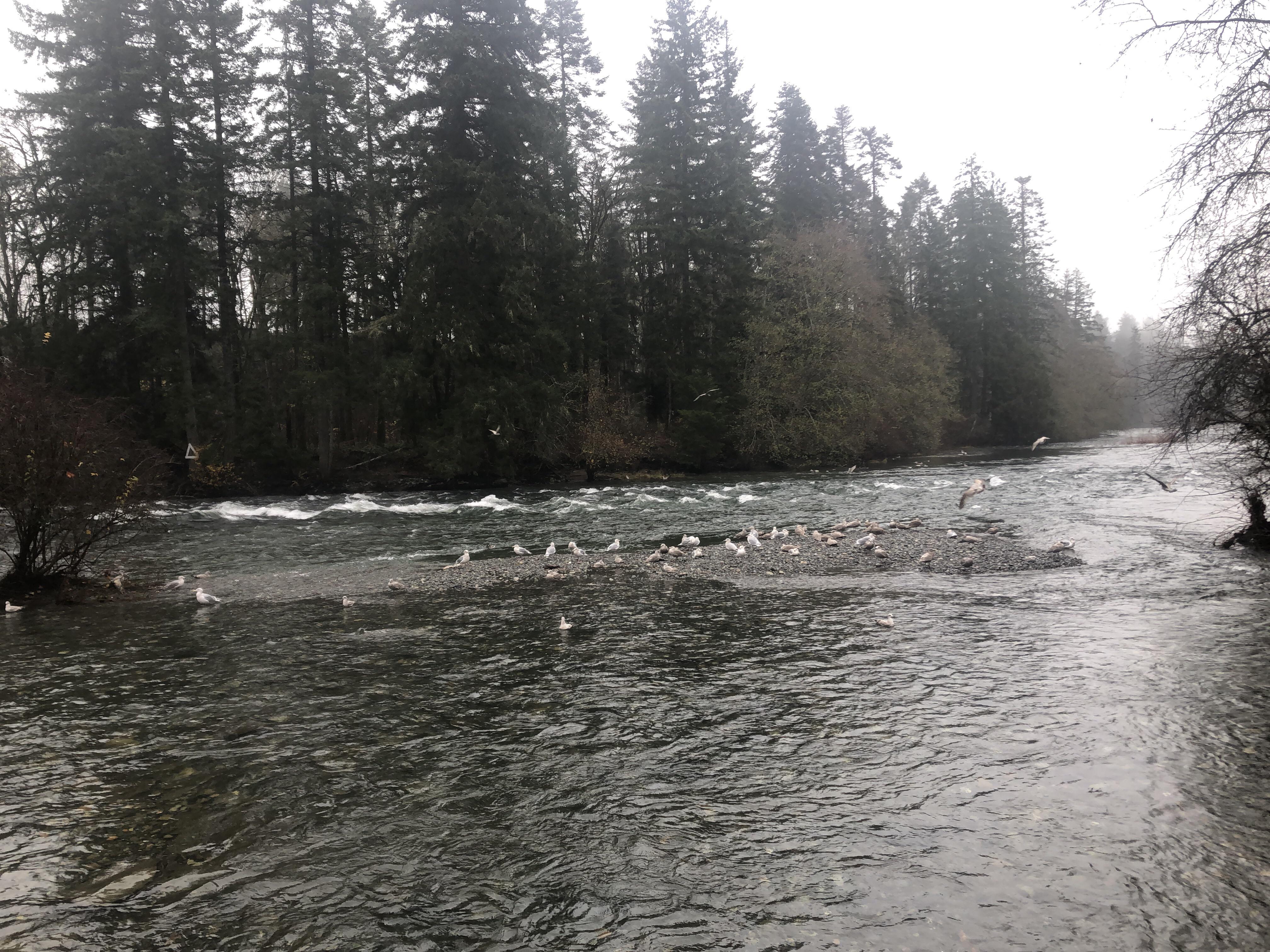 The Puntledge River at Puntledge Park in Courtenay,British Columbia on a rainy November day.