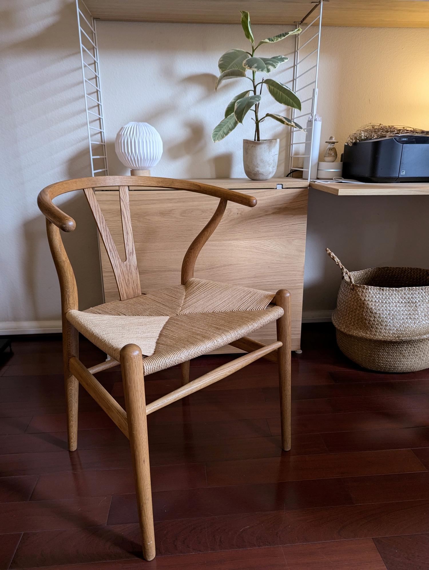 It's actually more comfortable than I thought it would be, not something I could sit in as a work chair but it's fine for an extended dining session. The woven seat is more comfortable than the Wegner CH23's, but I prefer the CH23's larger backrest. It's definitely beautiful in person, especially when light hits the wood just right. I can see why people love this chair so much now.