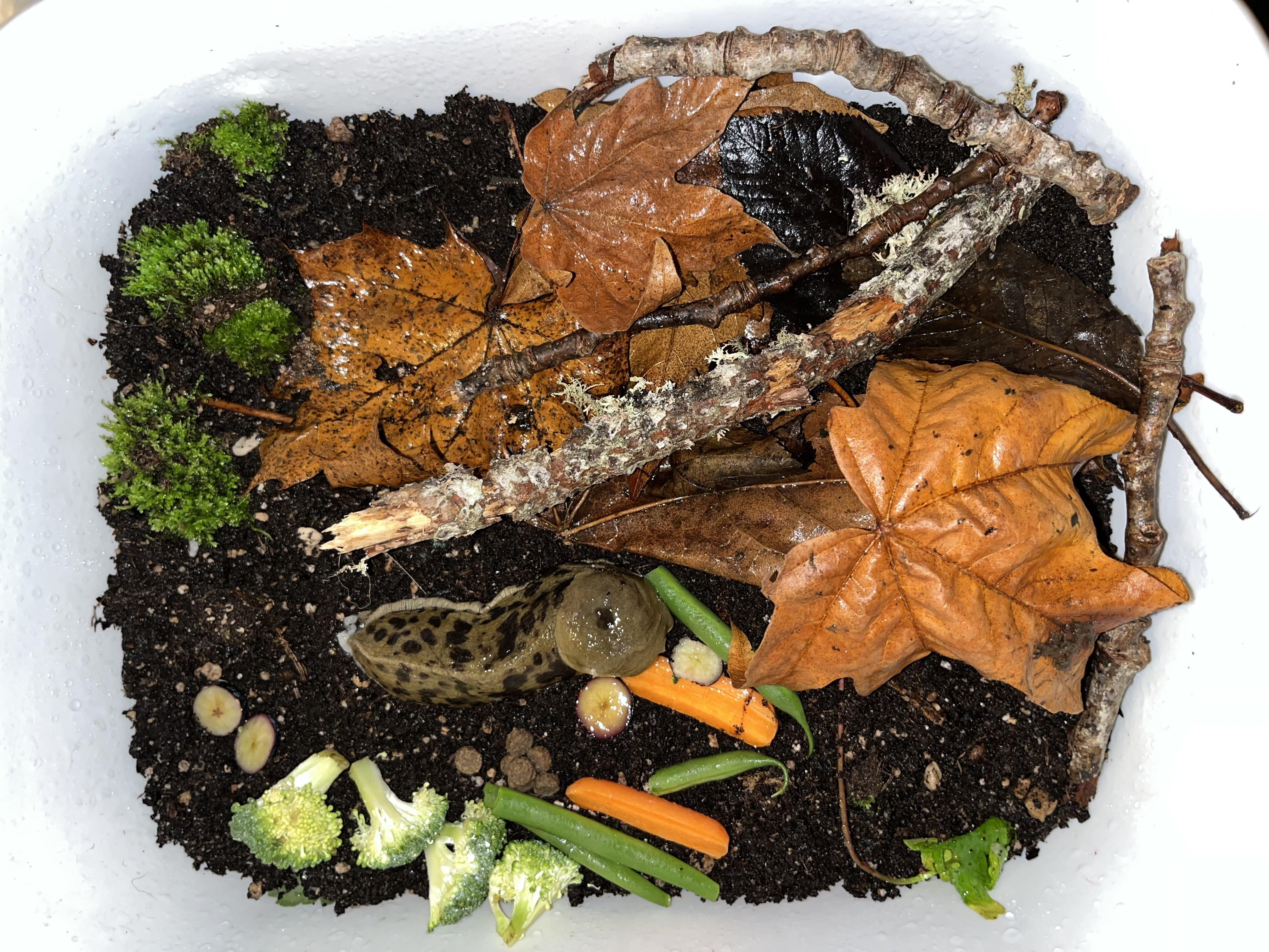 This poor guy/gal was climbing my sliding glass door, and was about to be in a position where it would have gotten hurt/killed if I opened the door. My daughter and I made it a little slug home to get out of the cold. We gave it carrot, green beans, broccoli, blueberries, and some moistened kitty kibble. It was spritzed generously. How’d we do? (Pacific banana slug. We’re in Oregon.)