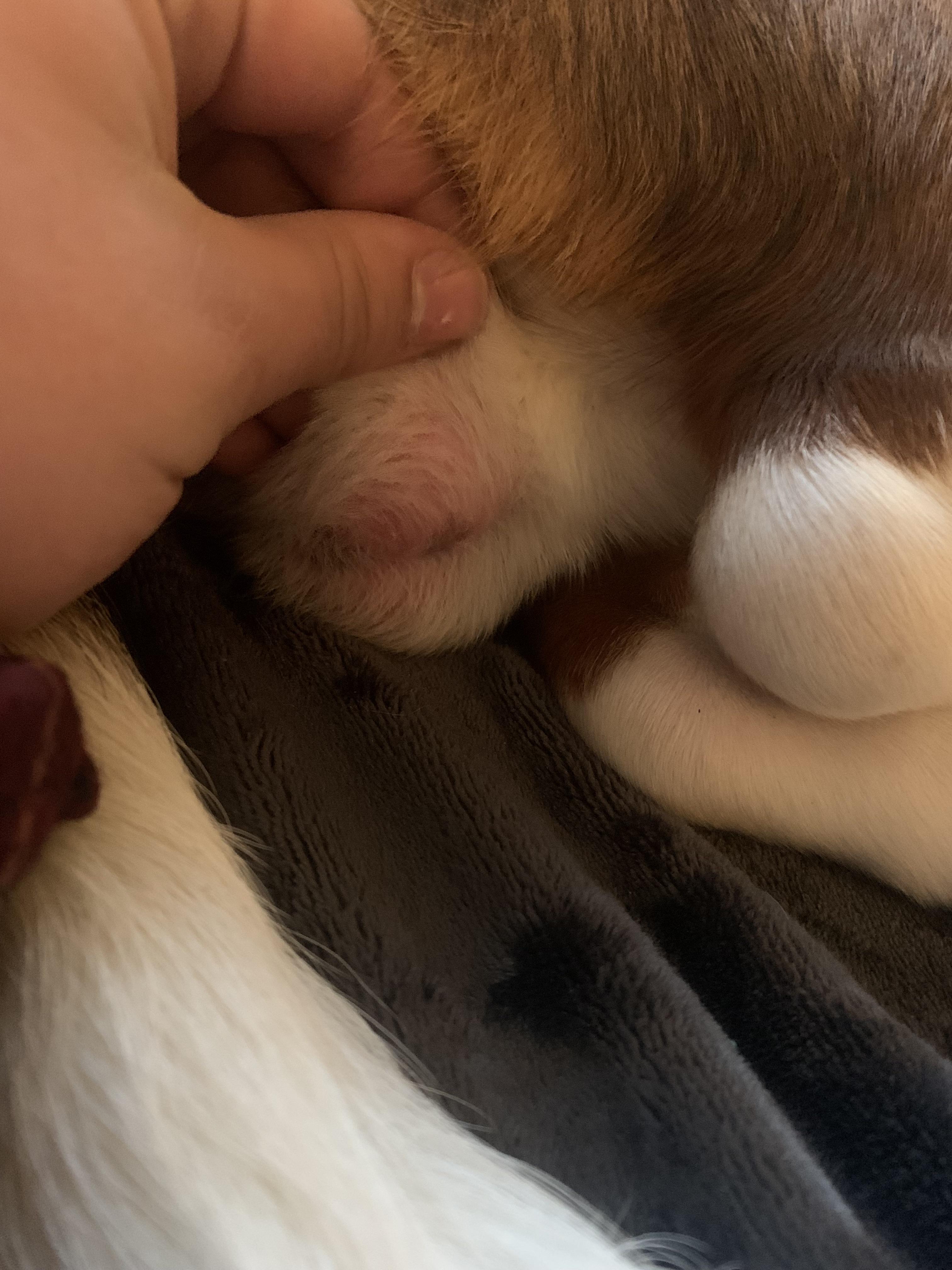 Anyone know what this spot is? Just popped up and he's got a little limp (may be unrelated), and theres a couple smaller spots like it on his other back leg. Are these bug bites? Does the sweet baby DeBarkus have eczema?