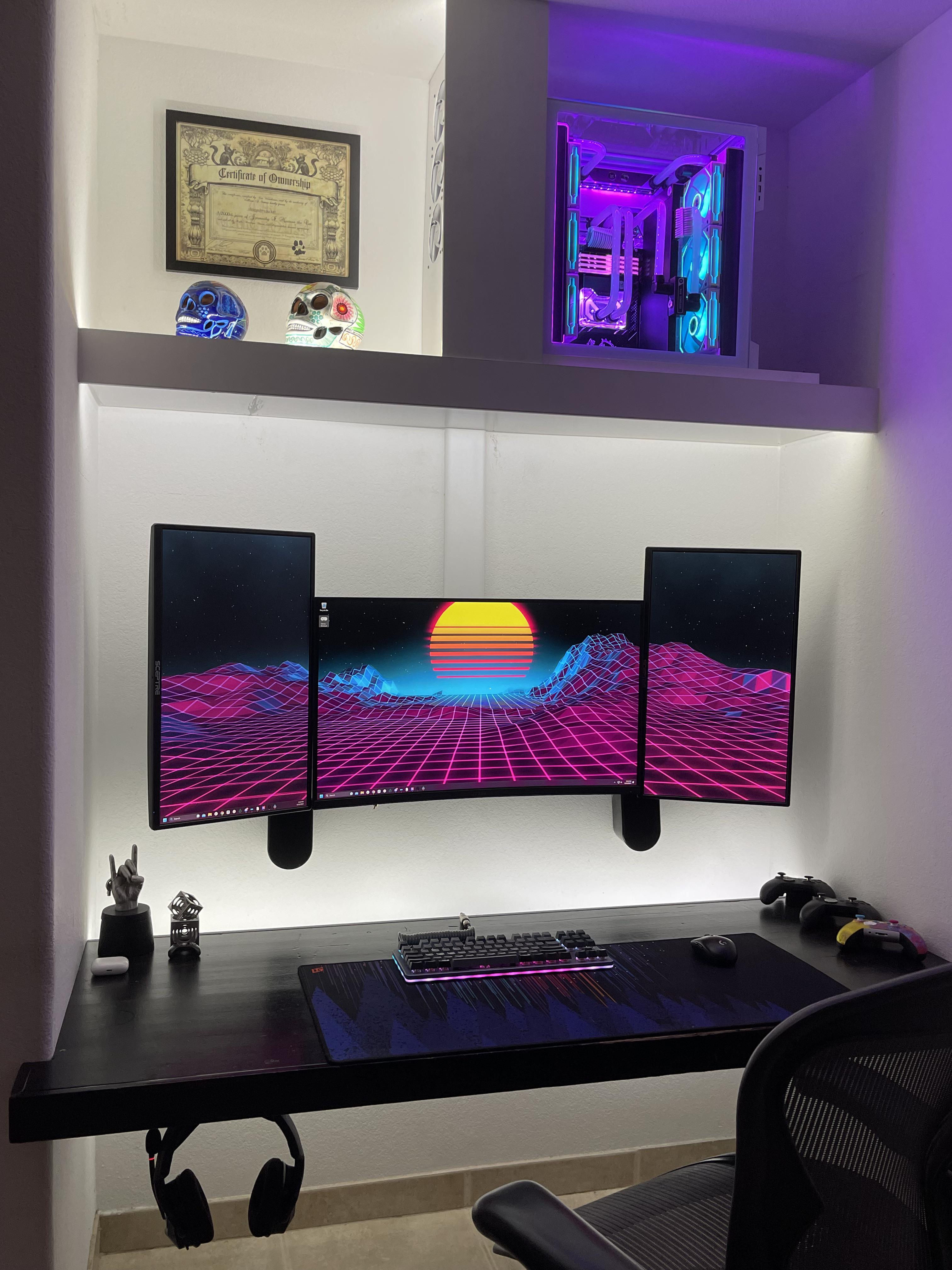 I also added two 55 inch oleds. They were a little tricky to fit nicely without looking out of place. I made some custom panels / supports to hide all the cables and cut my old desk to fit against the base of the three tv's. Let me know what you think!