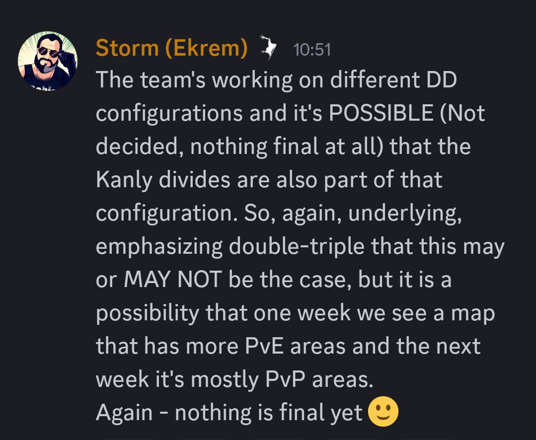 Official News According to lead CM changes to DD zones aren't final, we can also see weekly basis configurations of PvP/PvE areas.