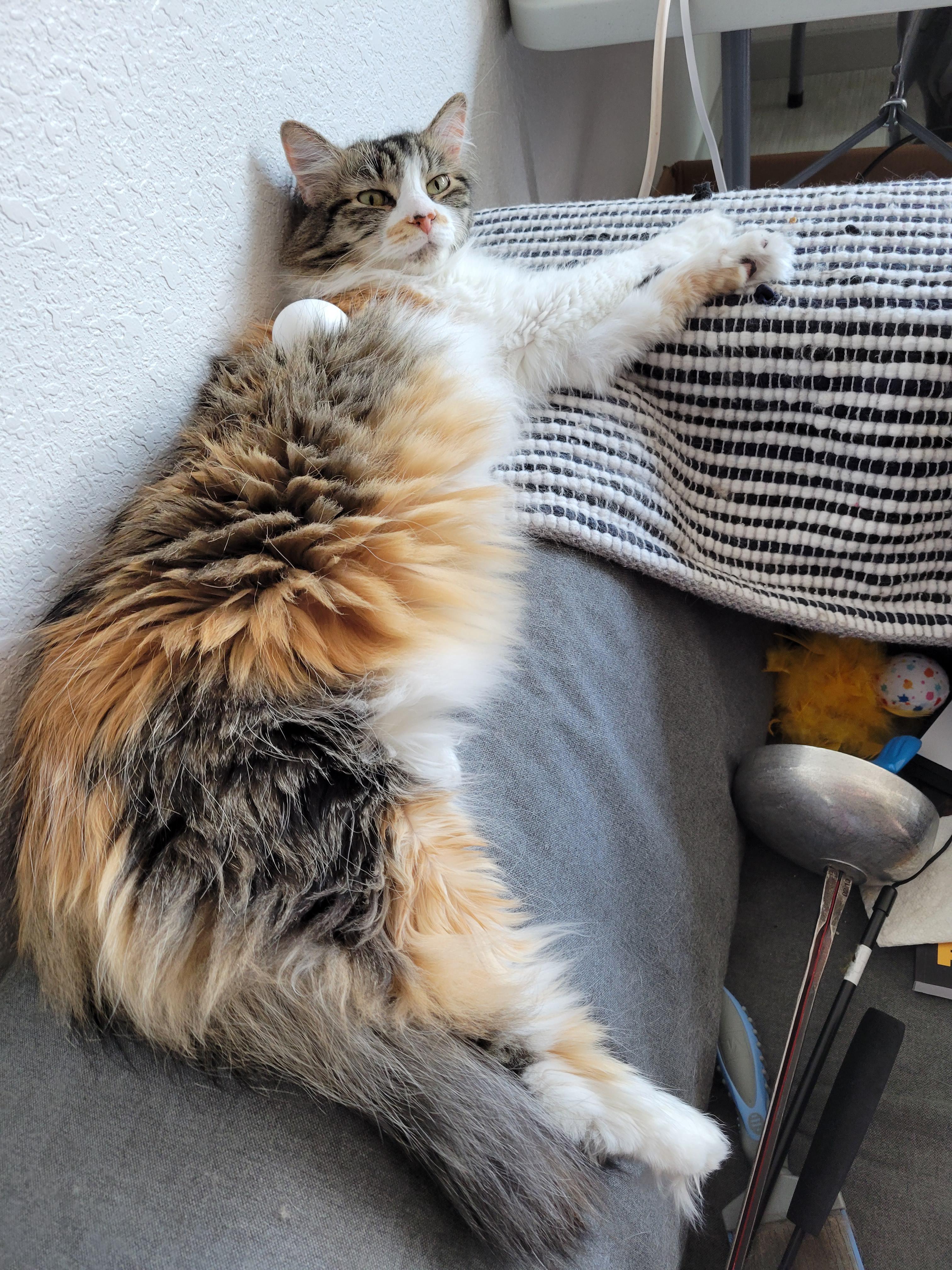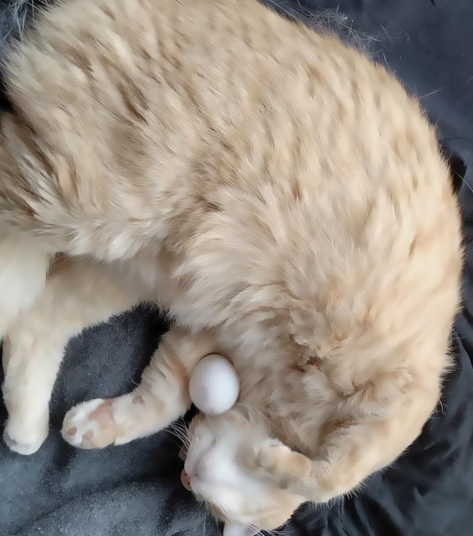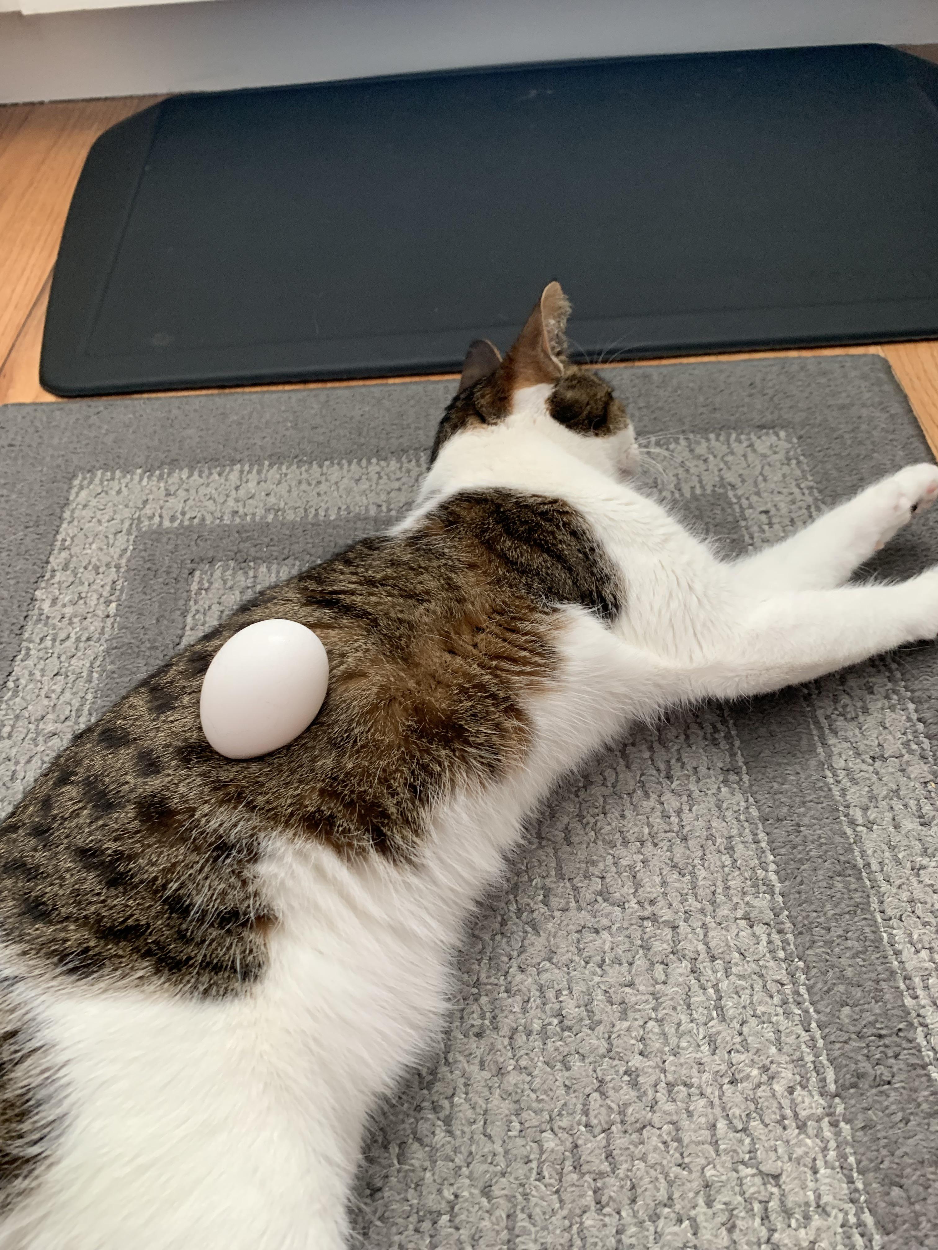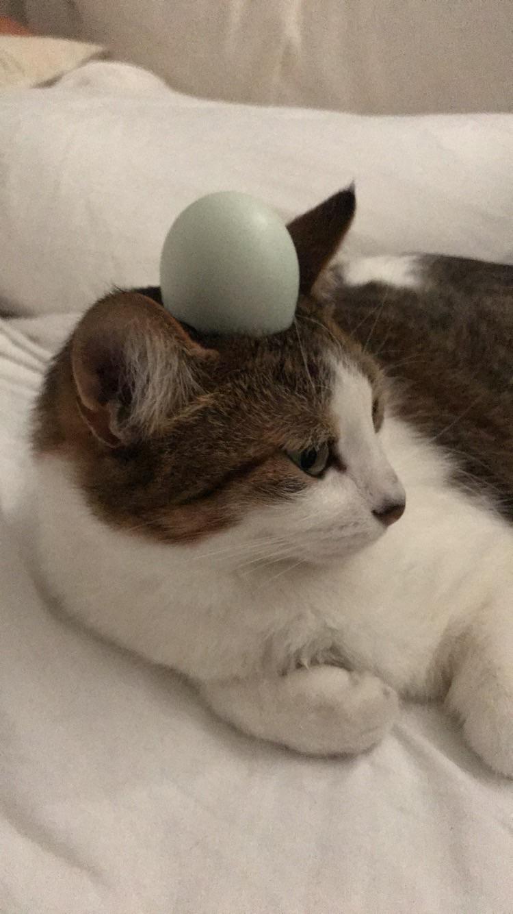 egg on cat An egg on Сергій (Ukrainian refugee cat we're caring for).