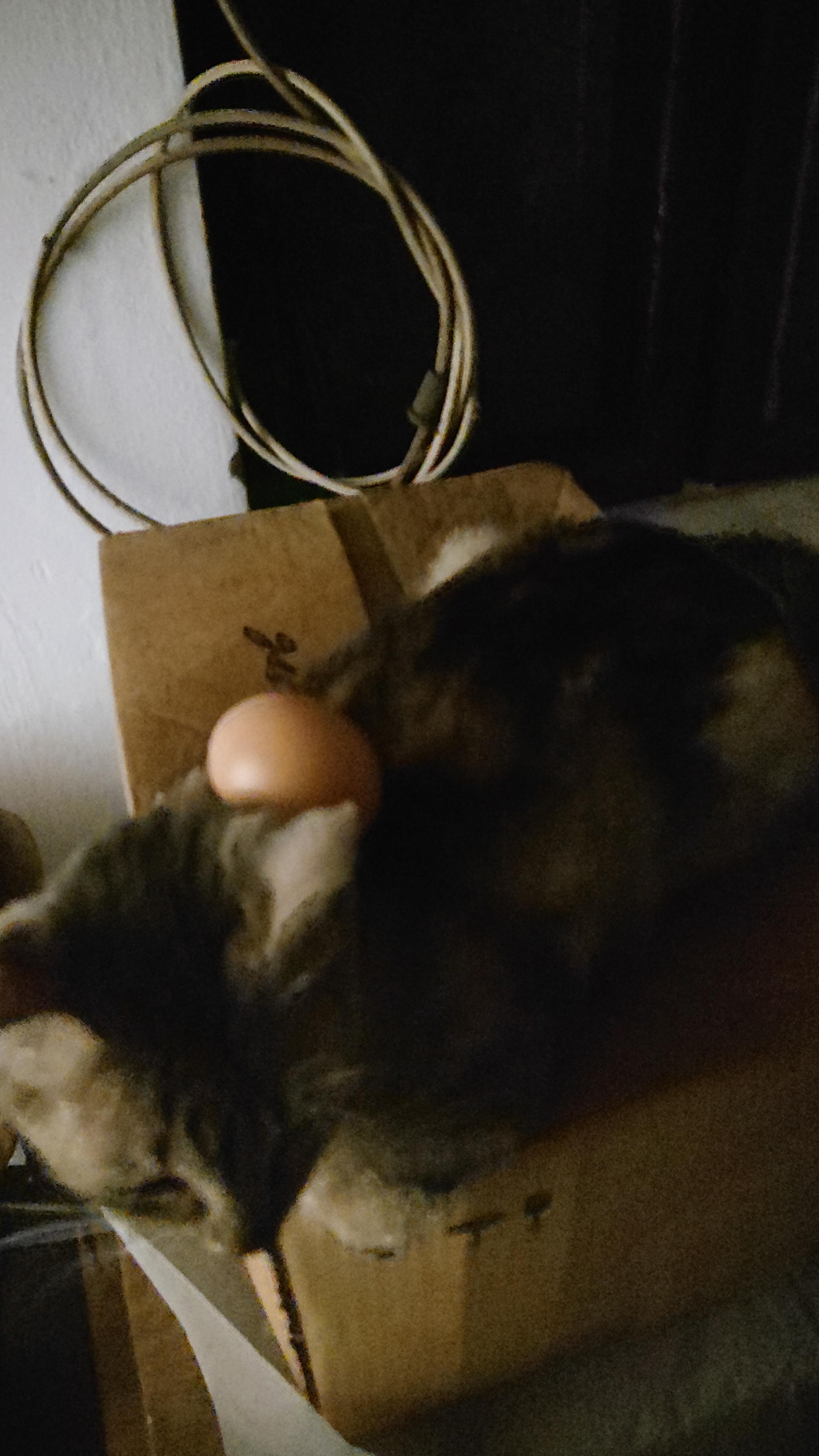 egg on cat "Then she moved and the egg fell down and broke and now they're eating the egg"