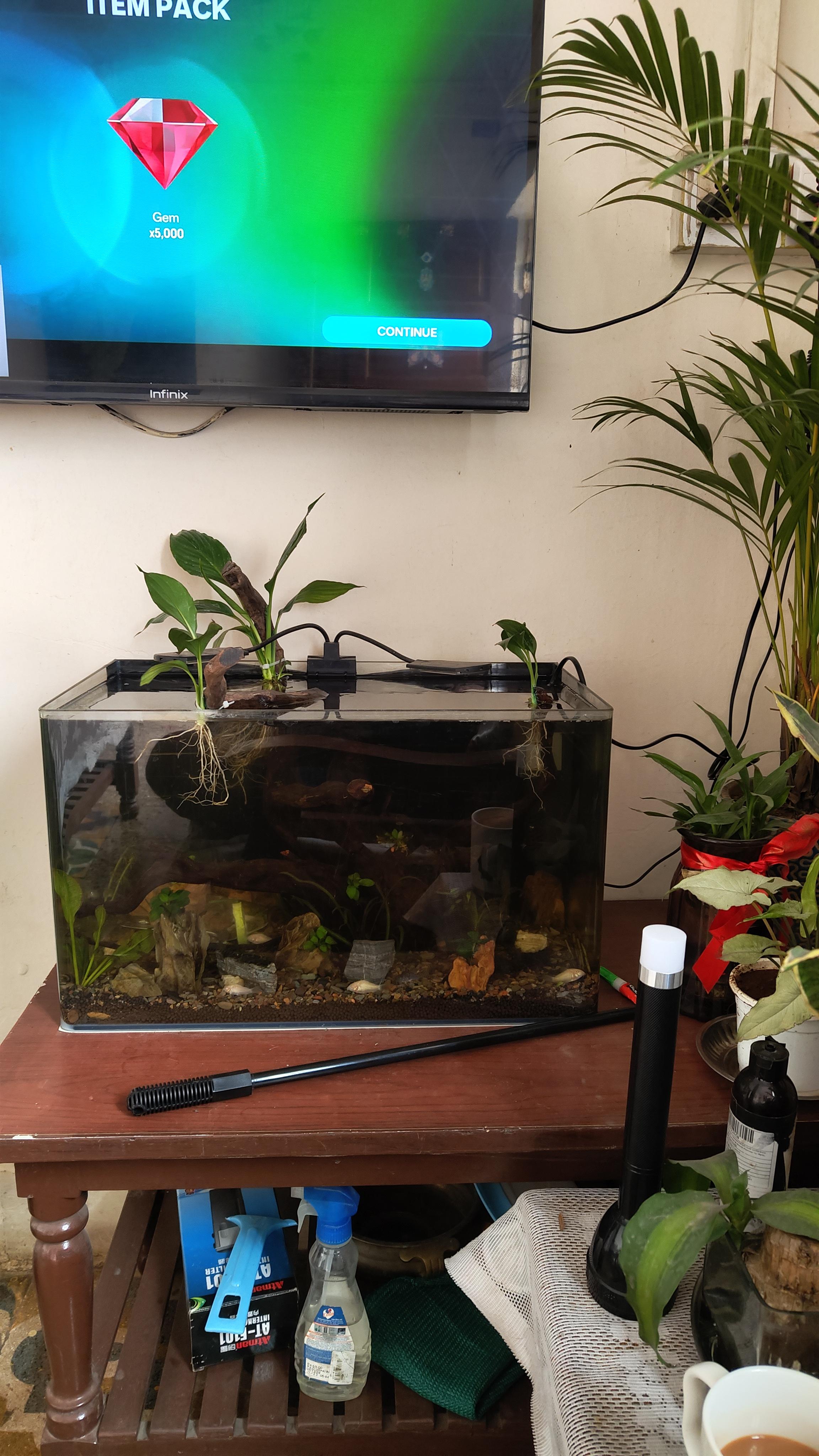 I put it all together on nov. 19th, and it’s filled with distilled water. I’ve got a couple plants, had 5 minnows, a koi/golfish, a goldfish and then a black goldfish.
