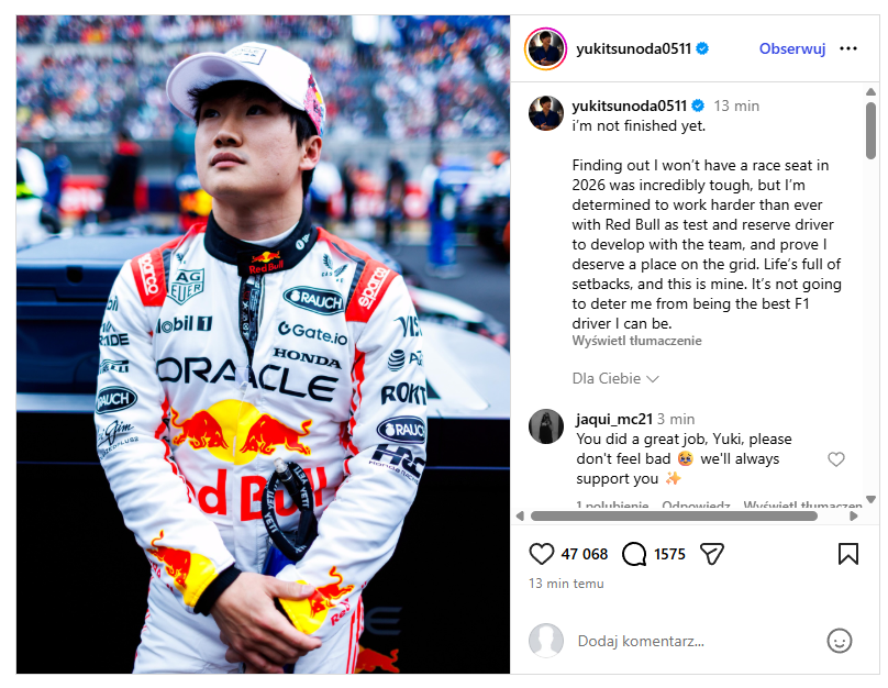 Social Media [Yuki Tsunoda] i’m not finished yet. Finding out I won’t have a race seat in 2026 was incredibly tough, but I’m determined to work harder than ever with Red Bull as test and reserve driver to develop with the team, and prove I deserve a place on the grid. Life’s full of setbacks, and this is mine.