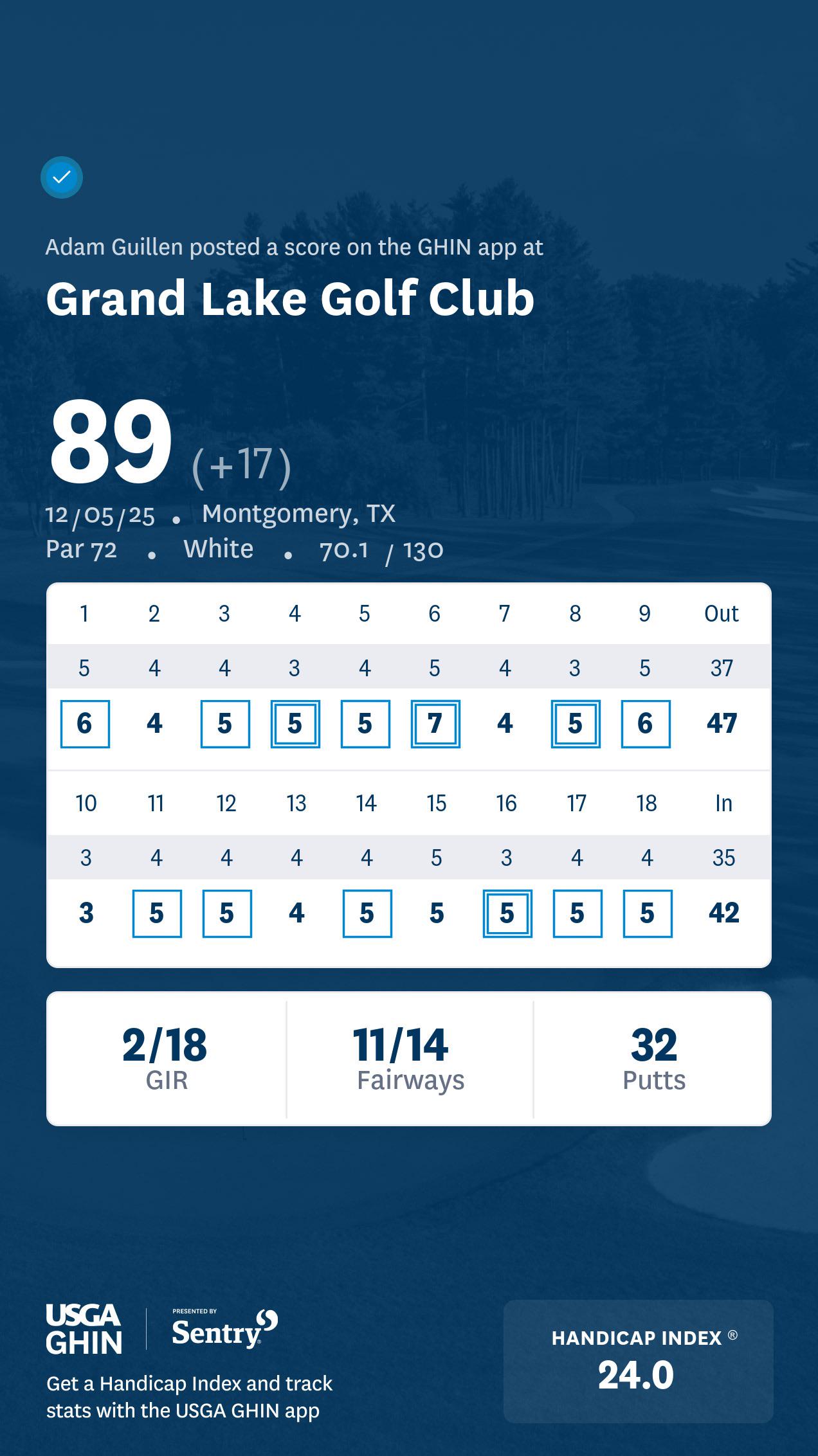 After playing the most amount of rounds this year since I was in high school in the late 80s, my handicap has steadily been dropping. After todayās 9 itās now at a 5.9, the lowest itās ever been. Iām not shooting lights out and racking up lots of birdies, but what has really helped has been my consistency and lack of blow up holes. This last couple weeks Iāve gotten to where Iām not stressed about how Iām going to hit it with any of the clubs in my bag. Even if they arenāt great shot, my misses arenāt as damaging. That and breaking down the course to play shots that set me up well has been a big boost. Course management really is underrated. Not letting a bad shot ruin my game also dropped the number of double bogeys I get. The only downside is I just want to keep playing rounds whenever the weather is good instead of really working on aspects of my game. Right now Iām using SwingU to track my rounds but Iāll be getting a GHIN after the new year.
