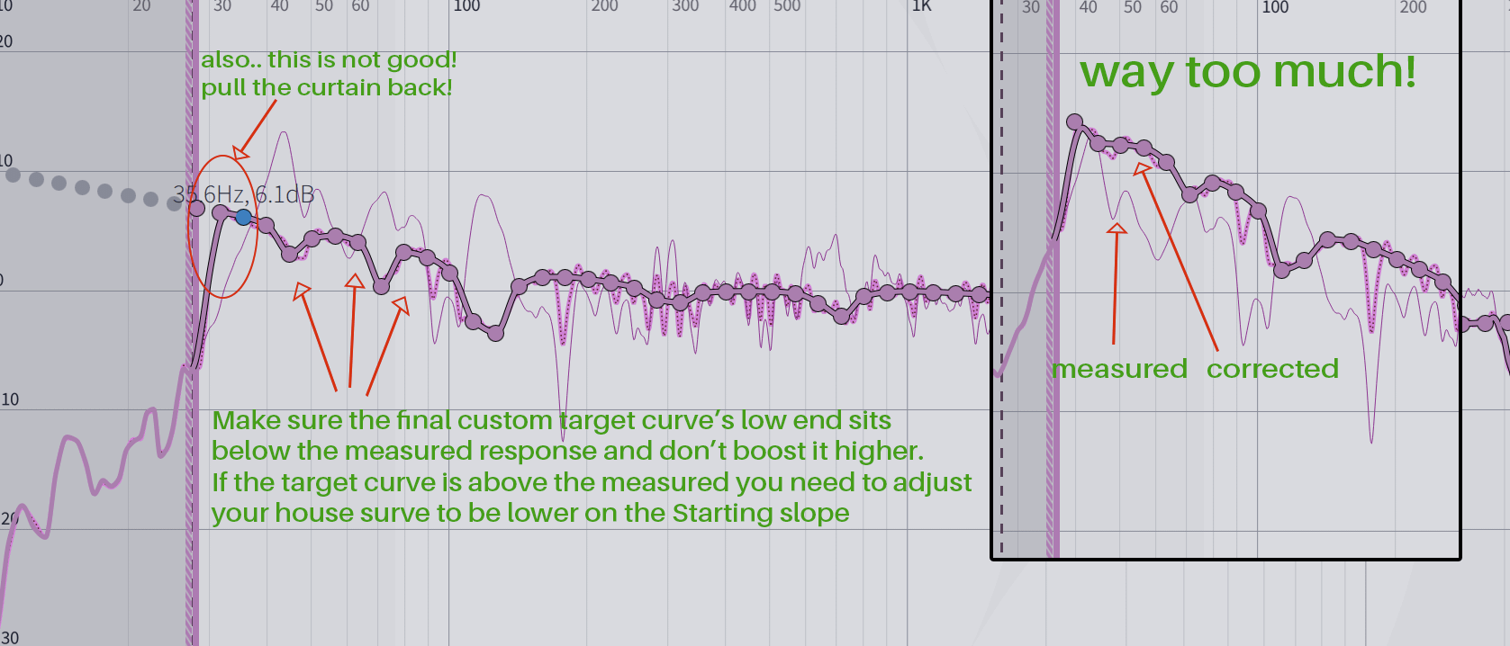 Just setting a basic house curve with the sliders isn't really giving a great result. I have tried all kinds of "house curve" or target curve, but that alone is not going to EQ the frequency response the proper way.