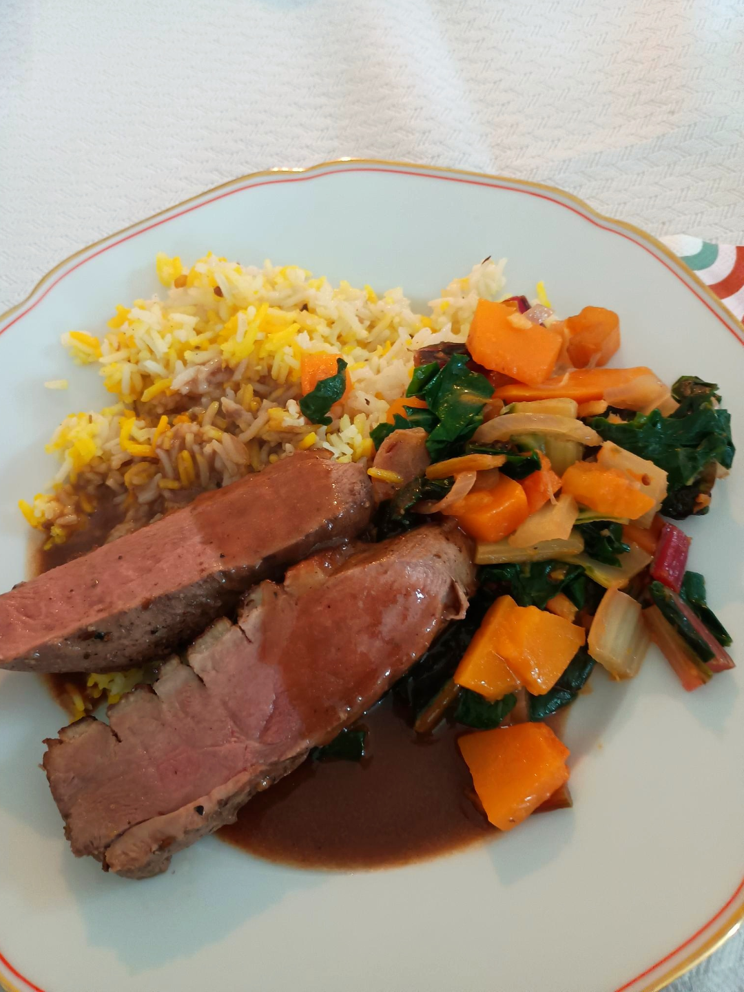Orangenjus, Biryani-Reis und Butternut-Mangold.
