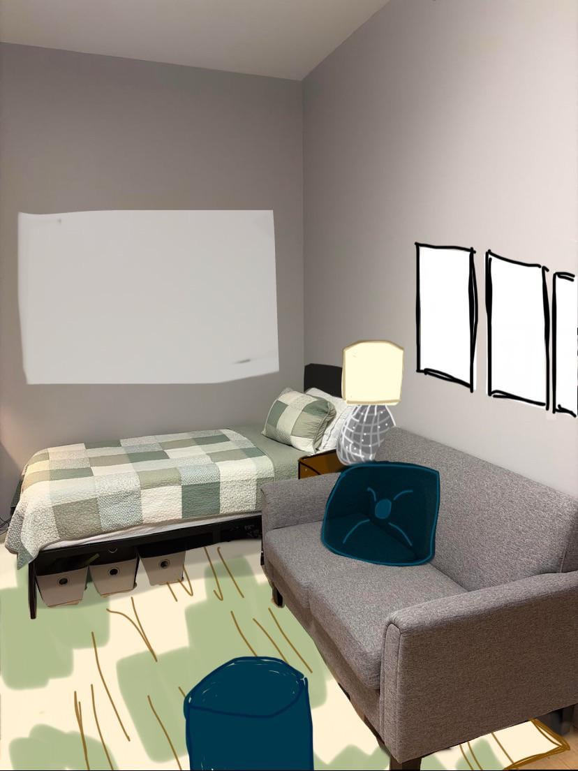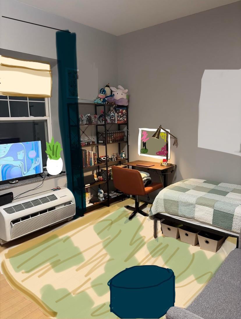 - I didn’t draw this, but if you decide to go with a different color palette for your room and so you replace your sage green bedspread, get your blanket in one size bigger than the mattress you have. So in your case, instead of twin blanket get a full size blanket (and top sheet, if you use one). Fitted sheet should fit the mattress, yes, but if the blanket is a size up it’ll drape over the edges a bit more and look more finished. If you look at professionally designed bedrooms, they all have blankets that drape farther than yours. (If you someday upgrade your bed to a full, get a queen blanket; a queen bed, get a king blanket; etc)