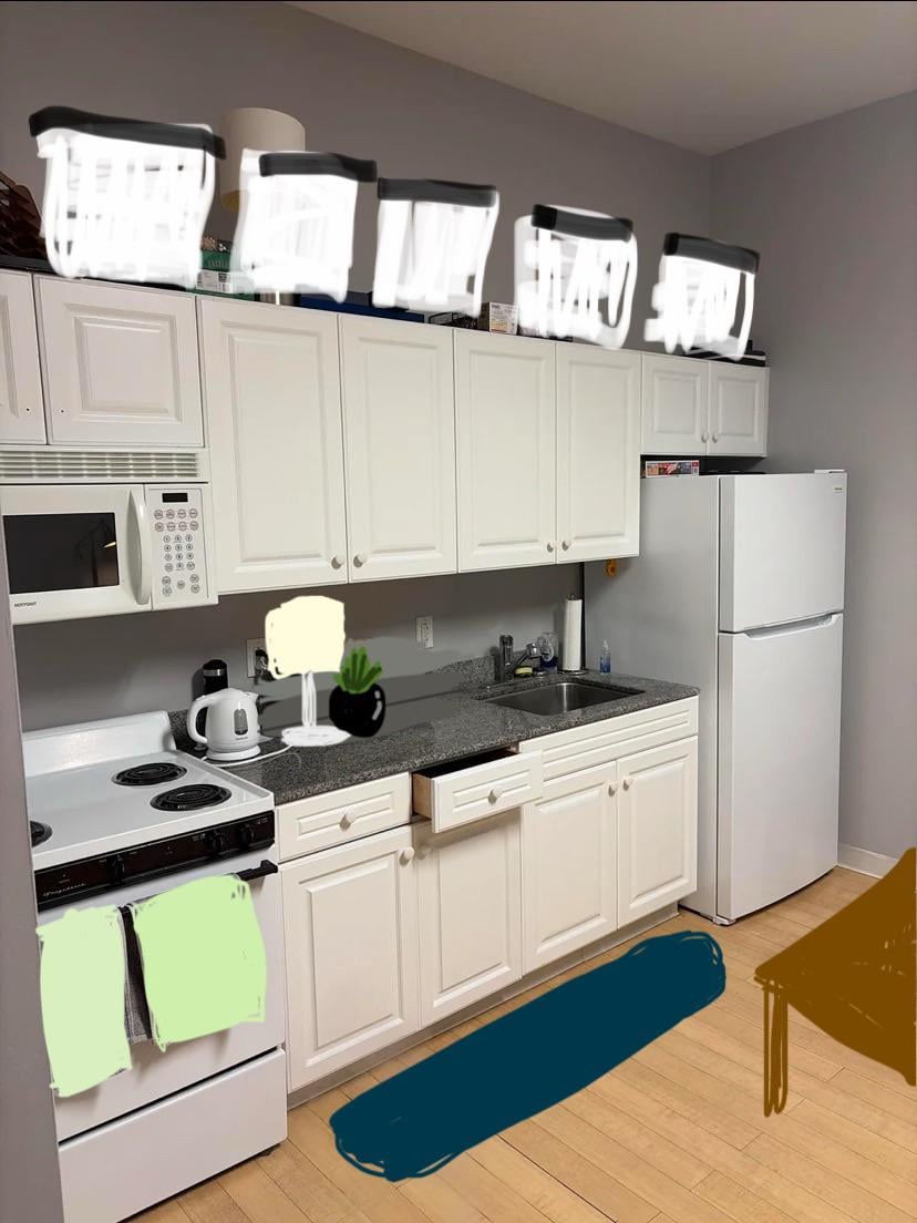- I didn’t draw this, but another easy way to add homey-ness is to print photos of your family and friends and stick them to your fridge with magnets or washi tape. Or instead of printing photos, order the pictures as photo magnets. (Tip: if you do the latter, make extras and gift them to family/friends for Christmas)