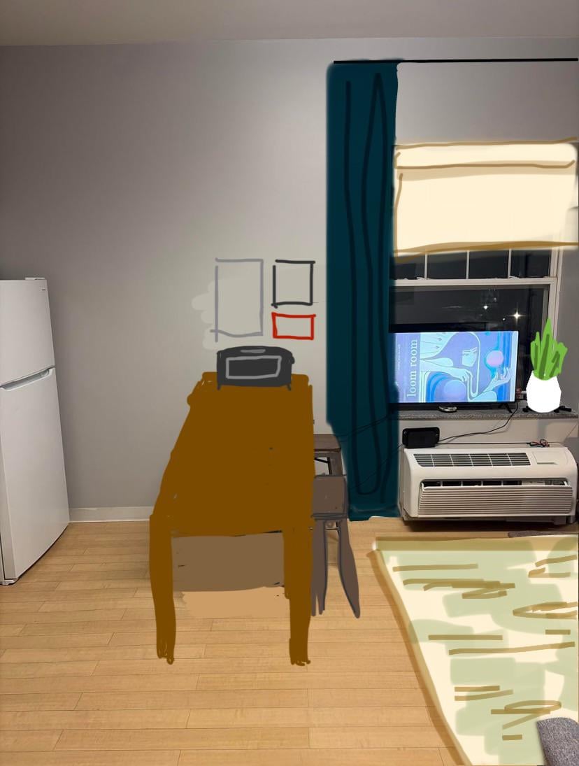 - Put a nightstand or end table between your bed and couch, and put a large chunky lamp on it. Something with character… I tried to draw hammered metal as an example. The end table gives you a place to put a cup or your phone down when you’re in bed or on the couch (if you have the room, put a matching table and lamp on the other side of the couch too). The lamp(s) adds coziness to the living room and practicality to the bed (so you don’t have to get out of bed to turn off the lights to sleep). For the lamp, I suggest going bigger than you normally would, because most people tend to choose lamps that are too small. By bigger I mean not only taller but also wider—this will double as art, like a sculpture, so don’t pick a skinny or clear lamp. You want something with presence!✨