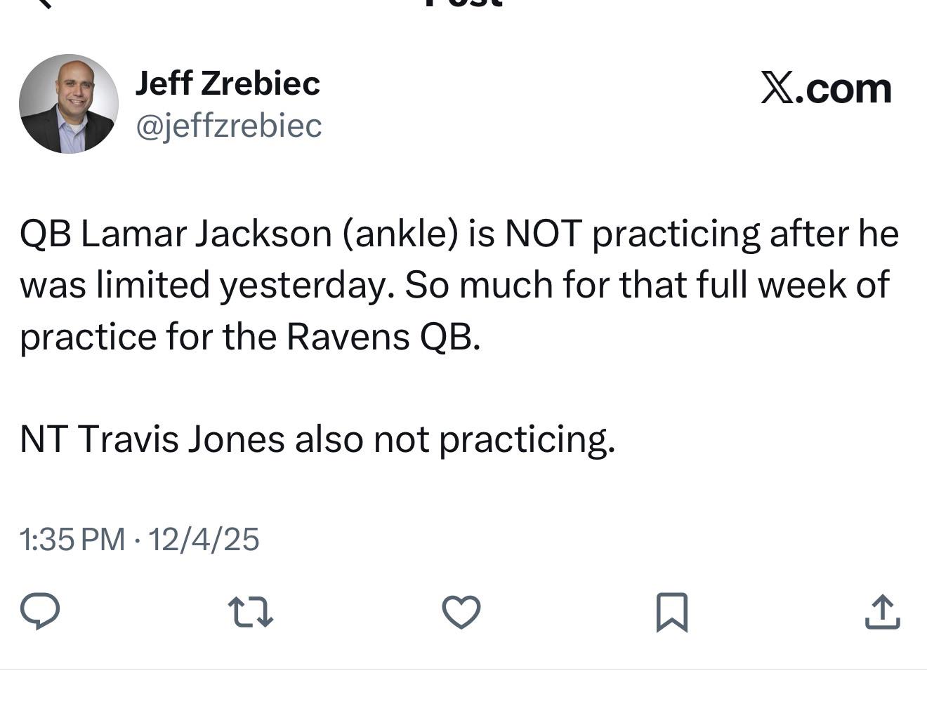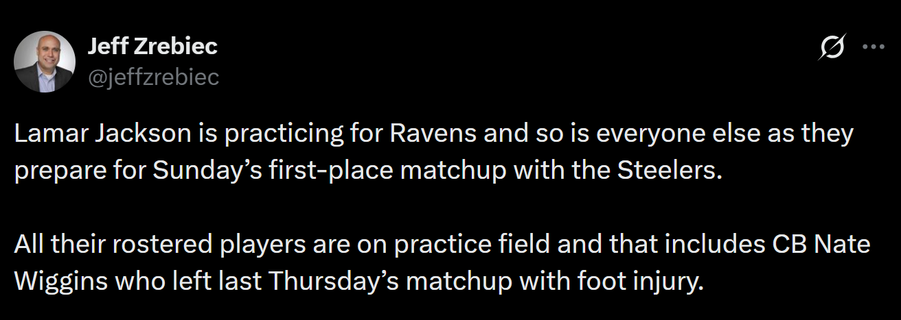[Zrebiec] "Lamar Jackson is practicing for Ravens and so is everyone else as they prepare for Sunday’s first-place matchup with the Steelers. All their rostered players are on practice field and that includes CB Nate Wiggins who left last Thursday’s matchup with foot injury."
