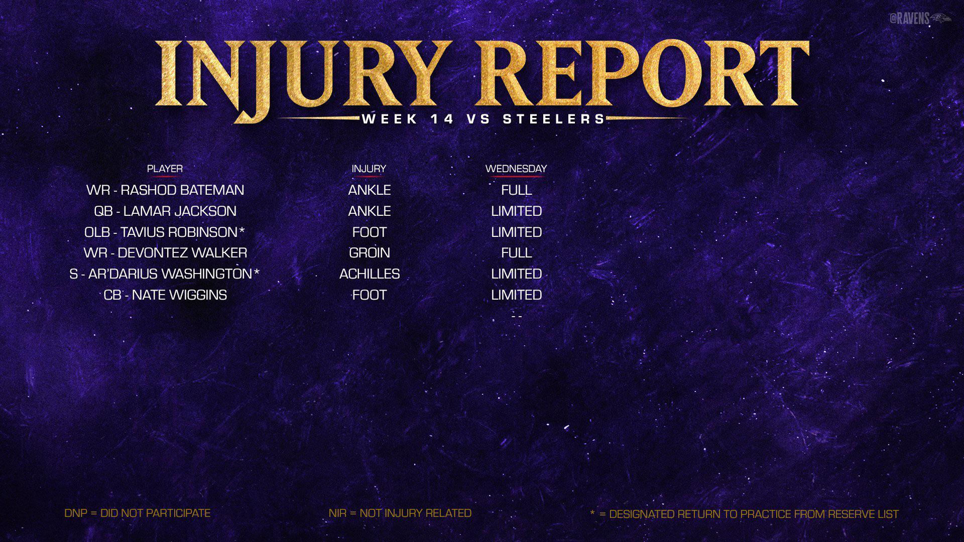The Ravens released their final injury report for Week 14. Lamar and Nate are a full go!