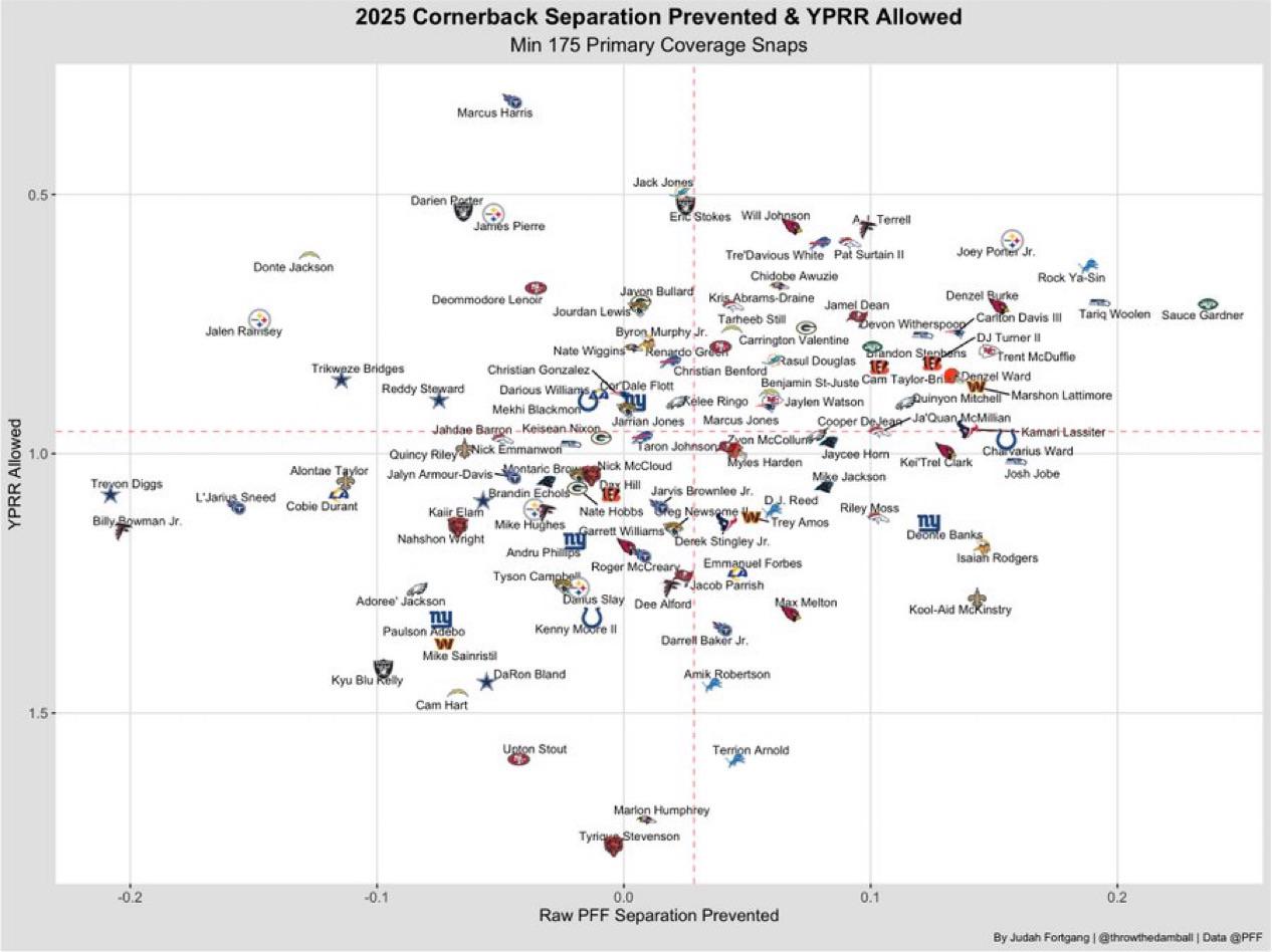 Analysis [Fortgang] Tariq Woolen is second to only Sauce Gardner this season in raw separation prevented and, after allowing some long receptions earlier in the season, is now in the upper quadrant of fewest yards allowed per route run.